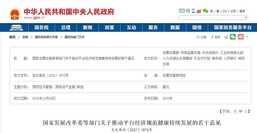近日,國(guó)家發(fā)展改革委等九部門發(fā)布關(guān)于推動(dòng)平臺(tái)經(jīng)濟(jì)規(guī)范健康持續(xù)發(fā)展的若干意見,《意見》要求健全完善規(guī)則制度,提升監(jiān)管能力和水平,優(yōu)化發(fā)展環(huán)境,增強(qiáng)創(chuàng)新發(fā)展能力,賦能經(jīng)濟(jì)轉(zhuǎn)型發(fā)展,加強(qiáng)保障措施。
